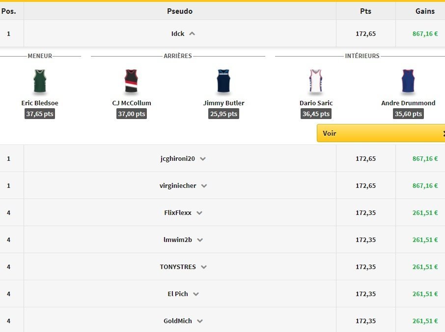 Trois équipes terminent premières avec 172.65 pts et 867.16€ chacun. Elles étaient composées de Bledsoe, McCollum, Butler, Saric et Drummond