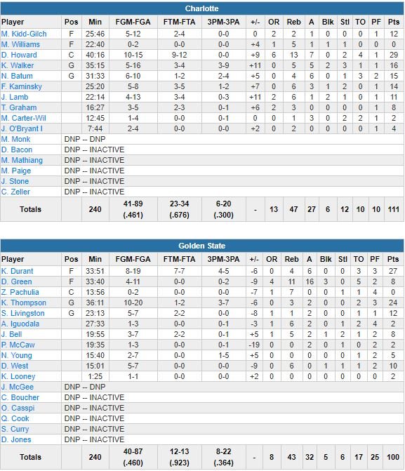 Menés 79-75 avant de débuter les 12 dernières minutes, Kevin Durant (27 points à 8/19, 4 rebonds et 6 passes), Klay Thompson (24 points à 10/20), Draymond Green (8 points à 4/11, 11 rebonds, 16 passes, 3 contres) & co ne se rapprocheront pas à moins de 3 points dans le dernier quart. Les Hornets se sont même offert un 11-0 pour s’envoler 95-81 à 6’30 du buzzer. Durant a réduit l’écart à 10 points en enchaînant 3-points et 3-points avec la faute en 26 secondes, mais Walker lui a répondu par un tir longue distance qui a définitivement mis fin aux espoirs des Warriors. Ces derners paient leurs 17 ballons perdus, qui ont généré 32 points des Hornets.