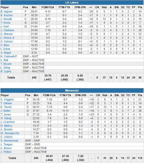 Les Lakers s’inclinent eux pour la 7ème fois d’affilée et la 10ème fois en 11 matchs. Jordan Clarkson termine meilleur marqueur des siens avec 20 points, Julius Randle signe 15 points et 12 rebonds, Brandon Ingram 14 points et Kyle Kuzma, leading scorer de l’équipe avec 17.9 points par match, à seulement 6 points en 18 minutes. Les Lakers reviennent au mieux à 5 points en début de 3ème quart mais prennent ensuite un 13-0 qui trace une autoroute vers la victoire à leurs adversaires en fin de période.