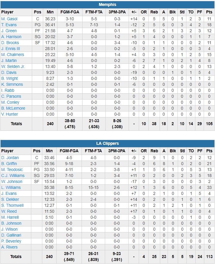 Los Angeles a pris 10 points d’avance dans le 3ème quart-temps avant d’encaisser un 22-5. Un run auquel ils répondront par un 9-0 pour reprendre les commandes 86-84 avant de débuter le dernier quart, remporté 27-21. Tyreke Evans termine meilleur marqueur des Grizzlies avec 18 points (6 passes, 5 rebonds), Mario Chalmers ajoute 15 points en sortie de banc. Le rookie C.J. Williams bat son record en carrière avec 18 points pour les Clippers (54.9% de réussite sur ce match). Marc Gasol a été limité à 11 points à 3/10, 5 rebonds et 5 passes.