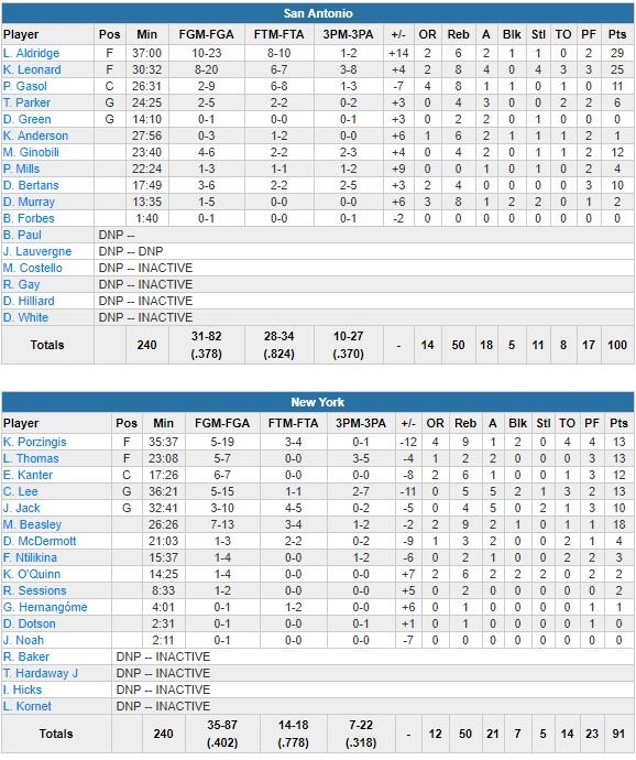 Pour la deuxième fois en 6 jours mais cette fois au Madison Square Garden, les Spurs ont battu les Knicks, 100-91. LaMarcus Aldridge et Kawhi Leonard ont respectivement inscrit 29 (10/23, 6 rebonds) et 25 points (season-high, 8/20 aux tirs, 8 rebonds, 4 passes et 4 interceptions), Manu Ginobili a ajouté 12 points (dont 3 sur un tir qui était en fait une passe) et San Antonio remporte un 4ème match en 5 rencontres.