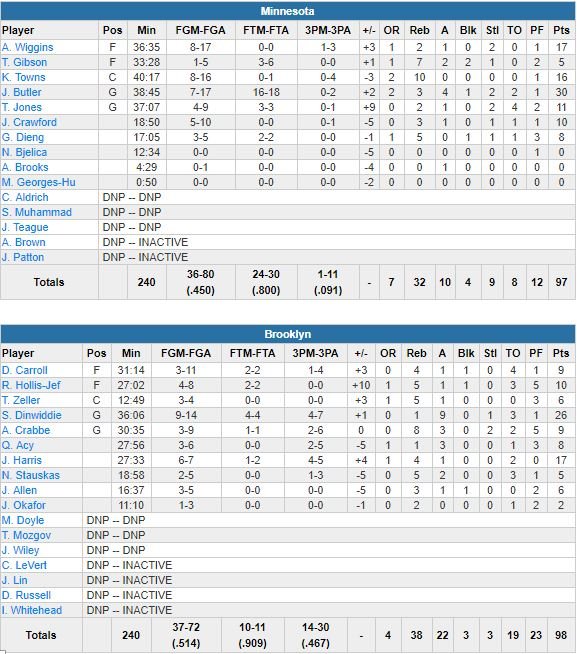 Jimmy Butler (30 points à 7/17, 3 rebonds et 4 passes) a ensuite manqué une tentative au buzzer et Minnesota (17 points d’Andrew Wiggins, 16 points et 10 rebonds de Karl-Anthony Towns) perd pour la 2ème fois seulement en 9 matchs. Après avoir passé un 17-0 et un 16-0 d’entrée aux Pacers et aux Lakers lors de leurs deux derniers matchs, les Wolves n’ont cette fois pas réussi à imposer leur rythme dès l’entame face aux Nets (17 points de Joe Harris en sortie de banc) au Barclays Center.
