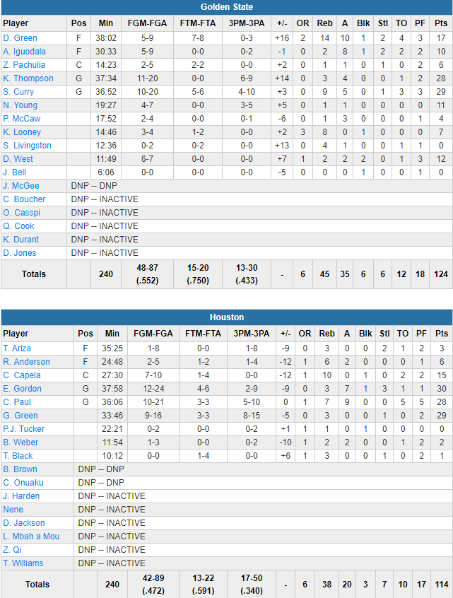 En l’absence de Kevin Durant, les Splash Brothers sont les hommes de la rencontre avec 28 points à 11/20 dont 6/9 à 3-pts de Klay Thompson et 29 points à 10/20 dont 4/10 à 3-pts, 9 rebonds et 5 passes pour Stephen Curry. Les Californiens ont shooté à 55.2% dont un excellent 13/30 à 3-pts alors que Draymond Green noircit la feuille de match avec un nouveau triple-double : 17 points, 14 rebonds et 10 passes. C’est son 21ème en carrière, un nouveau record de franchise. Andre Iguodala compile lui 10 points et 8 passes. En face les Rockets ont été menés par le trio Eric Gordon (30 points à 12/24 et 7 passes), Chris Paul (28 points à 10/22 dont 5/10 à 3-pts, 7 rebonds et 9 passes) et Gerald Green (29 points à 9/16 dont 8/15 à 3-pts). Houston shoote à seulement 17/50 derrière l’arc et 46.7% au tir.