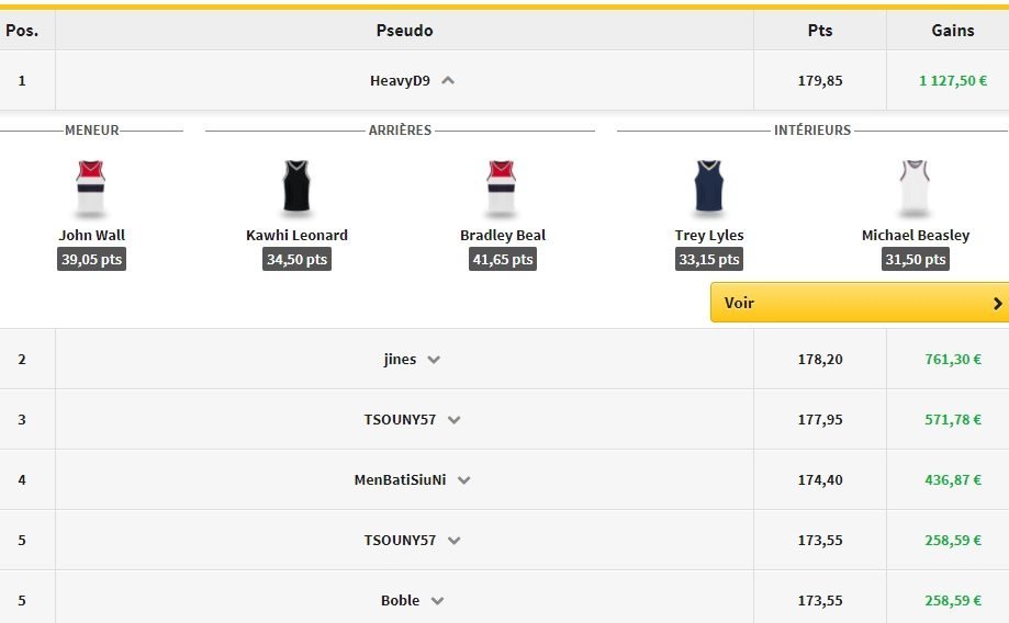 C’est HeavyD9 qui remporte le gros lot avec un 5 : Wall, Leonard, Beal, Lyles et Beasley. Il totalise 179.85 points pour 1127.5€