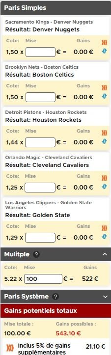C’est très risqué mais loin d’être importable, on va donc miser sur une cote de 5.22 (elle peut varier), soit un gain potentiel de 443.10€ grâce à un bonus en mettant les 100€ du pari remboursé.