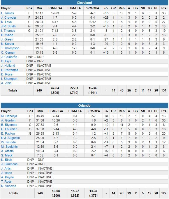 LeBron James termine à 33 points à 12/23, 10 rebonds, 9 passes et 6 interceptions et a été précieux lorsqu’il a fallu garder un minimum de sang-froid dans le money time. En face Aaron Gordon signe 30 points (dont 11 dans le 4ème quart) à 13/26 et 8 rebonds. Auteur de 16 points et 9 rebonds, Dwyane Wade a sauvé un ballon important avant de rentrer un layup à 17.8 secondes du buzzer suite à un airball d’Isaiah Thomas (titulaire pour la première fois, 19 points et 4 passes). Kevin Love plante 6 tirs à 3-points sur le match pour 27 points au total.