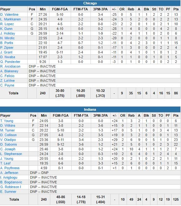 Victor Oladipo était l’homme qui tombe à pic cette nuit. De retour d’une blessure au genou après 4 matchs d’absence, l’arrière a inscrit 23 points à 9/11 et soigné sa ligne de stats avec 6 rebonds, 9 passes et 5 interceptions (dont 4 dans le 1er quart) pour permettre à Indiana de mettre fin à une série de 5 défaites. Les Pacers n’ont pas fait les choses à moitié pour la réception de Chicago, avec une victoire 125-86.