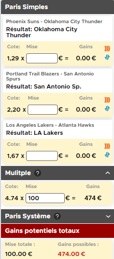 C’est très risqué mais loin d’être importable, on va donc miser sur une cote de 4.74 (elle peut varier), soit un gain potentiel de 374€ grâce à un bonus en mettant les 100€ du pari remboursé.