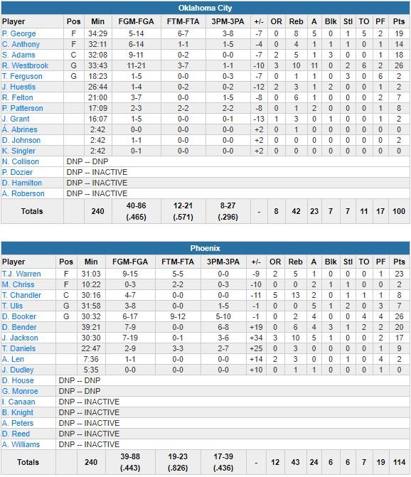 Un 3-points de Booker à 7’56 de la fin du 3ème quart a donné 14 points d’avance à Phoenix (74-60) mais le Thunder va y répondre par un 15-2 pour reprendre l’avantage 76-75 à 5’03. Bender à 3-points lance un 14-4 en faveur des locaux, puis Jackson lui aussi de loin porte le score à 90-79 à 32 secondes de la fin de la période. OKC ne comptera finalement que 8 points de retard avant de jouer le dernier quart grâce à un and one de Carmelo Anthony (14 points). Un nouveau run (14-2 pour s’envoler 107-97 à 6’42) de Phoenix finira par mettre tout le monde d’accord