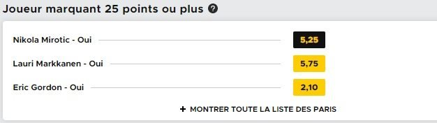 En vous inscrivant ici chez notre partenaire Betclic, votre premier pari est remboursé à hauteur de 100€*, pourquoi ne pas en profiter pour flamber un peu puisque vous ne risquez rien ? Ce soir on vous propose de miser sur une performance individuelle, celle de Lauri Markkanen. Les Bulls recoivent les Rockets et il est fort possible qu’on ait un match offensif et donc quelques belles performances au scoring. Le rookie sort de quelques bonnes performances et il pourrait profiter de l’absence possible de Nikola Mirotic pour sortir une grosse perf, et notamment un match à au moins 25 points. C’est un risque à prendre au vu de la cote de 5.75 (elle peut varier). On va miser, ce qui nous donne un gain potentiel de 475€.