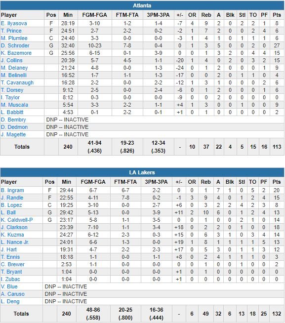 Atlanta, qui avait démarré son match sur un 10-2, est au mieux revenu à 13 points à 10’09 de la fin du 4ème quart, mais une longue passe de Kuzma pour le dunk de Ball va redonner 17 points d’avance aux Lakers. Josh Hart (12 points à 4/7, 5 rebonds et 3 passes en 19 minutes) de loin donnera ensuite 26 points d’avance aux locaux, plus gros écart du match à 5’33 de la fin.