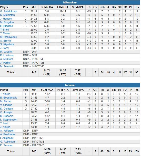 Après quelques premières minutes disputées, Indiana a su multiplié les pertes de balle adverse et forcer les Bucks à prendre de mauvais tirs alors que ces derniers avaient démarré leur match sur un 18/25. Le match a complètement basculé lorsque Indiana a passé un 20-0 dans le 1er quart et alors que l’équipe ne menait encore que d’un point, 15-14. Au final Indiana a bouclé la période sur un 22-2 et menait 37-16 après 12 minutes. Milwaukee, revenu au mieux à 16 points ne s’en est jamais remis (48-21 en milieu de 2ème quart, 64-38 à la pause).