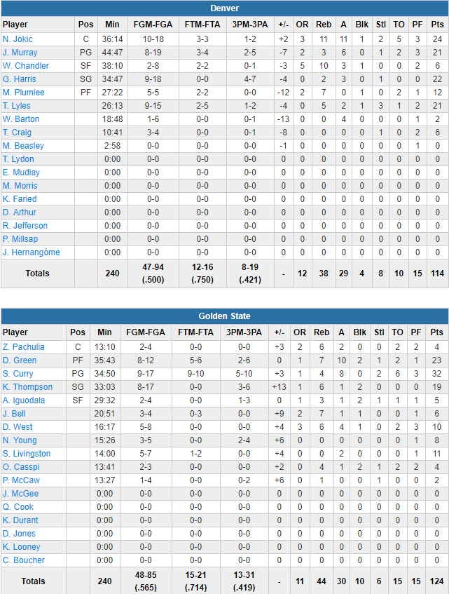 Stephen Curry est une nouvelle fois l’homme du match avec 32 points à 9/17 dont 5/10 à 3-pts, 4 rebonds, 9 passes, 2 interceptions mais 6 ballons perdus. Il a fait une petite frayeur à l’Oracle Arena en se faisant mal au genou en première mi-temps, avant de revenir une fois strappé. Draymond Green continue de noircir les feuilles de match avec 23 points à 8/12, 6 rebonds, 10 passes et 3 contres tandis que Klay Thompson ajoute 19 points à 8/17. Les Warriors shootent à 56.5% dont un 13/30 à 3-pts pour compenser 16 ballons perdus et un petit 15/21 sur la ligne des lancers. En face les Nuggets ont tenté de résister tant bien que mal avec un quatuor au-dessus des 20 points : 22 points, 12 rebonds, 11 passes, 3 interceptions et 6 ballons perdus pour Nikola Jokic, 22 points à 9/18 de Gary Harris et 21 points pour Jamal Murray et Trey Lyles.