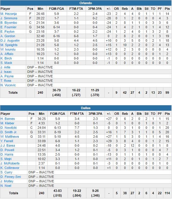 Voilà 5 matchs que le Magic, mené 48-43 à la pause, laissent ses adversaires passer la barre des 100 points. Son équipe devant 66-64 à 4’04 de la fin du 3ème quart-temps, Ferrell a rentré un pull-up puis Barnes un jump shot pour aider Dallas à creuser un écart (82-75) qui permettra à l’équipe d’aller au bout dans le dernier quart. Orlando est bien revenu à 4 points mais les Mavs (51.8% de réussite aux tirs et seulement 4 ballons perdus contre 45.6% et 13 ballons perdus) ont ensuite terminé leur match sur un 14-3 dans les 4 dernières minutes.