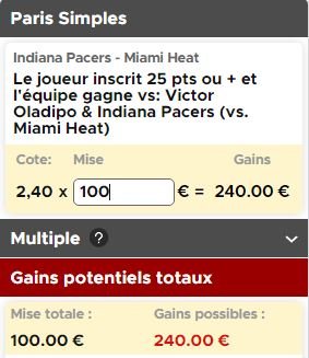 On vous conseille donc de miser les 100€ du pari remboursé sur une cote à 2,40 (elle peut varier) pour un match à au moins 25 points d’Oladipo, ce qui nous donne un gain potentiel de 140€.