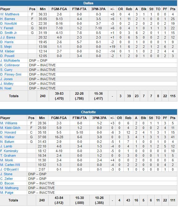 Dwight Howard signe 15 points et 12 rebonds mais handicape lourdement son équipe avec son 5/18 aux lancers-francs. Avant ce match, Charlotte sortait d’un repos de 4 jours, alors que les Mavs jouaient eux leur 3ème match en 4 jours. Menés de 6 points à l’entame du dernier quart, les Hornets ont réussi à égaliser à 9 minutes de la fin sur un 3-points de Jeremy Lamb. Mais l’équipe ne parviendra jamais à passer devant.