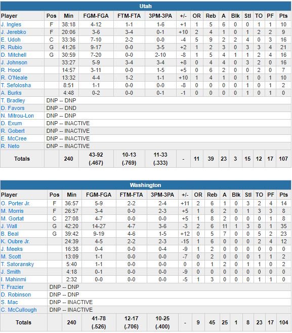 Le tout en jouant sans deux de ses titulaires (Rudy Gobert et Derrick Favors) et en ayant perdu son meilleur marqueur en saison (Rodney Hood) sur une exclusion en seconde mi-temps. Absent lors de la défaite de 47 points, John Wall a signé 35 points et 11 passes mais ses 8 ballons perdus font mal à l’équipe, qui en totalise 23 sur le match. Bradley Beal termine lui à 23 points mais a perdu un ballon à 2.9 secondes en tentant d’égaliser à 3-points. Washington, à 52.6% sur le match, n’a shooté qu’à 8/22 dans le dernier quart, entamé avec un retard de 10 points puis relancé suite à un 11-3 pour prendre un point d’avance. Joe Ingles a répondu au run adverse avec un 3-points (104-102 Utah à 1’09).