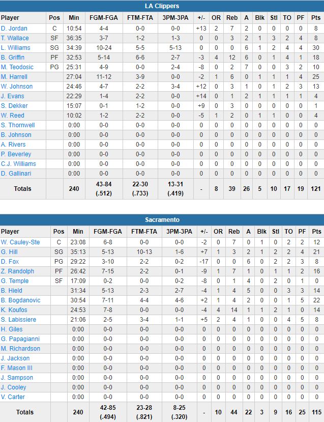 Blake Griffin et Milos Teodosic étaient de retour mais DeAndre Jordan a dû rapidement quitter ses coéquipier, blessé sur un poster dunk. Griffin signe 18 points à 5/14, 12 rebonds et 6 passes alors que Lou Williams est une nouvelle fois le meilleur marqueur avec 30 points à 10/24 dont 5/13 à 3-pts et 6 passes. En l’absence de Jordan, Montrezl Harrell est sorti du banc pour compiler 25 points à 11/12 et 6 rebonds tandis que Milos Tedosic ajoute 10 points et 7 passes. Les Clippers shootent à 51.2% dont un joli 13/31 derrière l’arc pour compenser leurs 17 ballons perdus alors que Sacramento shoote à 49.4% mais seulement 8/25 derrière l’arc. Bogdan Bogdanovic brille avec 22 points à 7/11 alors que George Hill signe 21 points à 5/13 et Zach Randolph 16 points à 7/15 et 7 rebonds.
