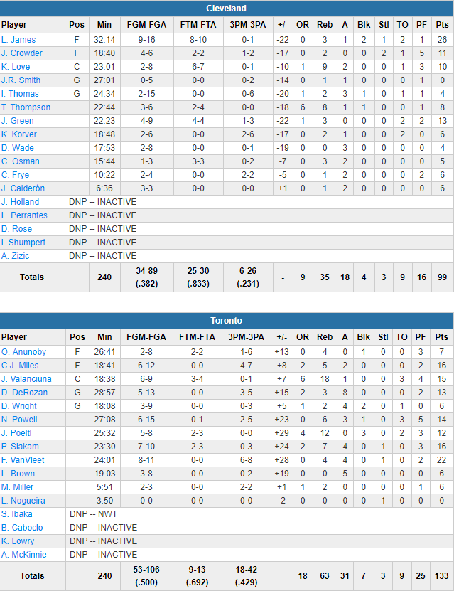 Les Canadiens se sont régalés avec 50 % au shoot dont un 18/42 à 3-pts tout en prenant 18 rebonds offensifs et perdant seulement 9 ballons ! La recette parfaite avec pas moins de 7 joueurs à au moins 10 points. Fred Van Vleet est le meilleur marqueur du match avec 22 points à 6/8 à 3-pts alors que DeMar DeRozan n’a pas eu à forcer en l’absence de Kyle Lowry et termine avec 13 points à 5/13 et 8 passes. Jonas Valanciunas fait un chantier avec 15 points et 18 rebonds alors que Jakob Poetl compile lui 12 points et 12 rebonds. En face les Cavs ont connu un calvaire des deux côtés du terrain, limités à 38.2% dont un horrible 6/26 derrière l’arc. LeBron James est le seul à avoir surnagé avec 26 points à 9/16 mais seulement 3 rebonds et 1 passe. Jeff Green ajoute 13 points, Kevin Love 10 à 2/8 et 9 rebonds alors qu‘Isaiah Thomas arrose avec 4 points à 2/15 dont 0/6 derrière l’arc et ses 11 premiers tirs ratés.
