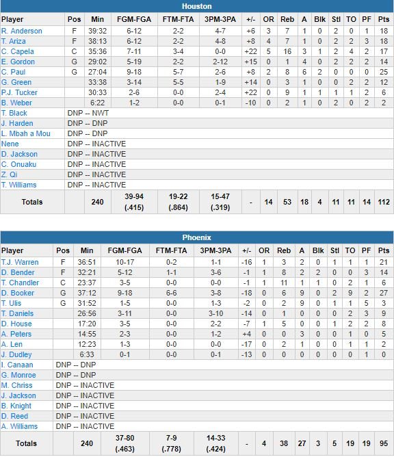 Pour son 6ème match sans James Harden, Houston a battu Phoenix 112-95 à la Talking Stick Resort Arena. Chris Paul, un des 6 Rockets à au moins 10 points dans ce match, termine meilleur marqueur des siens avec 25 points à 9/18, 8 rebonds et 6 passes.
