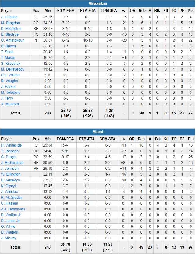 Les Bucks ont vécu un calvaire en attaque avec seulement 79 points à 31.6 % ! Les Floridiens, maladroits en première mi-temps, ont réglé la mire en seconde sous l’impulsion de Goran Dragic (25 points à 9/17 dont 4/8 à 3-pts) et Hassan Whiteside (15 points, 10 rebonds et 4 contres). Tyler Johnson ajoute 14 points à 5/11 et Josh Richardson 16 points à 6/9. En face Giannis Antetokounmpo est le meilleur marqueur mais il n’a pas pesé comme à son habitude avec 22 points à 6/12, 5 rebonds et 1 passe. Khris Middleton shoote à un horrible 3/16 pour 16 points alors que Malcolm Brogdon marque 15 points à 7/12.