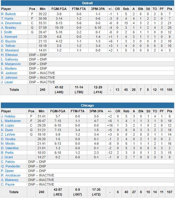 À noter : Avery Bradley termine à 26 points. Drummond a capté 8 rebonds offensifs, ce qui a permis à Detroit de dominer 30 à 6 sur les points inscrits sur seconde chance.