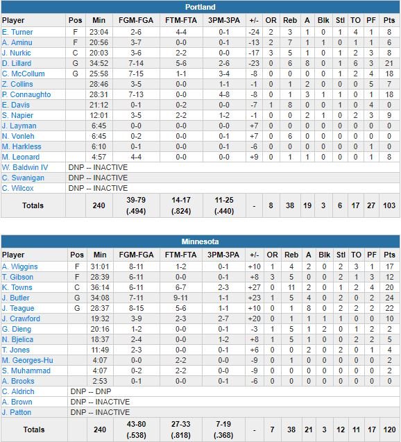 À noter : Portland menait de 3 points à la fin du 1er quart-temps mais n’a shooté qu’à 2/15 dans le 2ème, avec plus de points sur lancers-francs (6) que dans le jeu. Minnesota (11 victoires en 14 matchs) en a parfaitement profité en infligeant un 14-0 à ses adversaires. Les Blazers ont déjà marqué moins de points que dans le 2ème quart (10) cette saison : 6 points contre Toronto le 30 octobre.