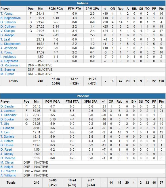 Sept joueurs d’Indiana ont terminé à au moins 10 points dont Darren Collison (19 points), Oladipo (13 de ses 17 points en 1ère mi-temps), Cory Joseph (16 points) et Bojan Bogdanovic (14 points). L’équipe a rapidement pris l’avantage sans plus jamais le lâcher dans ce match. Privés de leur meilleur scoreur (T.J. Warren, touché au dos), les Suns ont pris un 15-4 qui a laissé les Pacers s’éloigner 23-11 puis 30-16 après un quart-temps. Josh Jackson a battu son record en carrière (21 points) mais Devin Booker termine à 15 points à 5/16 (1/6 à 3-points) et son équipe perd un 4ème match en 5 rencontres. Indiana n’a pas levé le pied et grâce à un 16-8, s’est détaché 46-24 puis 64-44 à la pause. L’écart ira jusqu’à 33 points (92-59) sur un 3-points signé T.J. Leaf.