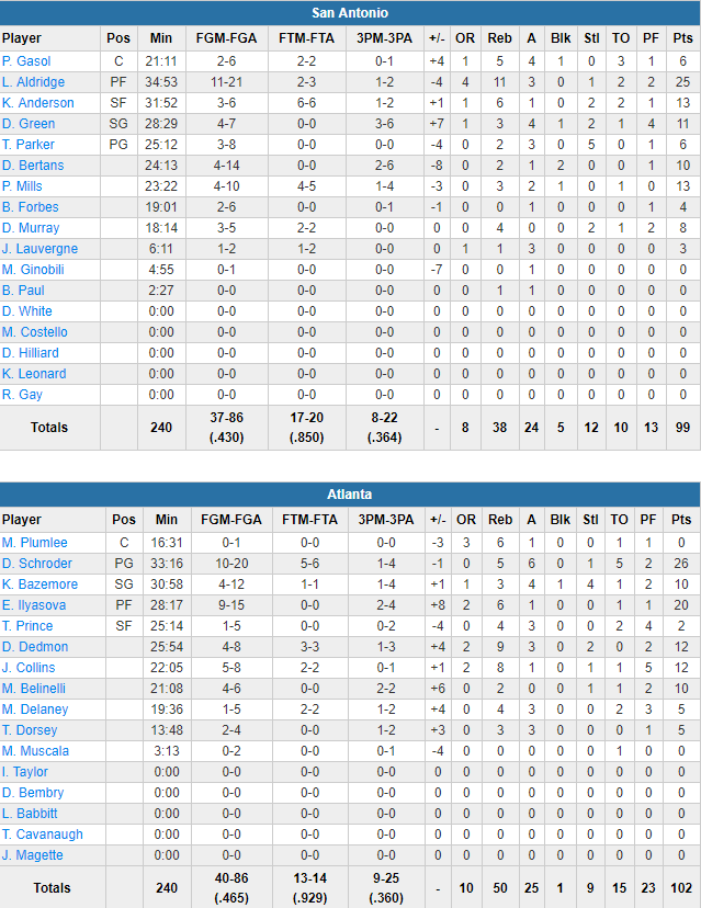 Schröder est l’homme du match avec 26 points à 10/20, 5 rebonds et 6 passes mais 5 ballons perdus. Il a été parfaitement épaulé par Ersan Ilyasova, auteur de 20 points à 9/15 et 6 rebonds. Dewayne Dedmon a lui été précieux dans le money time avec un 2+1 et 2 lancers clutchs. Face à son ancienne équipe il signe 12 points et 9 rebonds alors que John Collins compile 12 points et 8 rebonds. En face les Spurs ont encore manqué d’adresse avec un petit 43% dont un 8/22 derrière l’arc. LaMarcus Aldridge a surnagé avec 25 points à 11/21 et 11 rebonds alors que Kyle Anderson et Patty Mills en ajoutent 13 chacun. Tony Parker signe 6 points, 3 passes et 5 interceptions. A noter que Manu Ginobili s’est blessé après seulement 5 minutes de jeu et on n’en sait pas plus sur la gravité de la blessure.