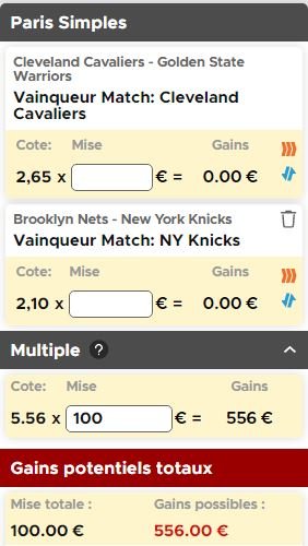 En vous inscrivant ici chez notre partenaire Betclic, votre premier pari est remboursé à hauteur de 100€*, pourquoi ne pas en profiter pour flamber un peu puisque vous ne risquez rien ? Ce soir on vous propose de miser sur deux grosses cotes à l’occasion du MLK (Martin Luther King) Day avec : une victoire des Cavaliers à domicile face aux Warriors et une victoire des Knicks chez leurs voisins de Brooklyn. C’est très risqué mais on va miser sur une cote de 5.56 (elle peut varier) pour ces deux victoires, soit un gain potentiel de 456€ en mettant les 100€ du pari remboursé.