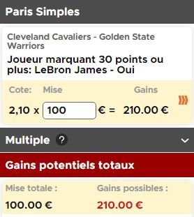 Pour le pari un peu moins risqué, on va miser sur un gros match de LeBron James, c’est-à-dire un match à au moins 30 points. La star des Cavs sort de matchs à 27, 26 et 10 points et il aura sans envie, comme toute son équipe, de mettre fin à la mauvaise série des Cavs contre les champions en titre. La cote de 2.10 (elle peut varier) est tentante, on va donc miser dessus, ce qui nous donne un gain potentiel de 110€.