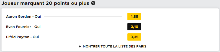 Pour le pari un peu moins risqué, on va miser sur un match à au moins 20 points d’Evan Fournier face aux Wolves. Avec l’absence de Nikola Vucevic, Evan a bien plus de responsabilités au scoring et le voir atteindre les 20 points de soir face à Minnesota, dans un match où le score devrait être élevé, ne sera pas une surprise. La cote de 2.1 (elle peut varier) est tentante, on va miser dessus, ce qui nous donne un gain potentiel de 110€.
