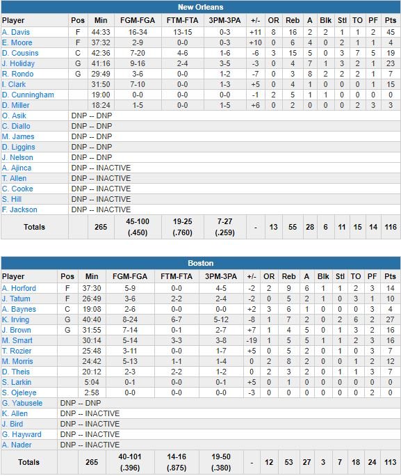 Kyrie Irving a terminé meilleur marqueur des locaux avec 27 points (8/24, 7 rebonds, 2 passes), dont 24 en seconde mi-temps pour aider son équipe à revenir d’un déficit de 12 points et prendre jusqu’à 5 points d’avance en fin de 4ème quart-temps. Marcus Smart et Jaylen Brown signent 16 points chacun pour une équipe de Boston qui a pris le risque de tout miser sur l’extérieur plutôt que de défier Davis et Cousins dans la peinture et qui l’a payé avec un petit 1/4 aux tirs sur les 5 dernières minutes du match. Al Horford de loin a donné l’avantage aux verts 107-106, puis Boston est monté à 113-110. Cousins sur un jump shot a réduit l’écart à 113-112, puis Holiday a enchaîné 2 tirs réussis et Boston n’a plus réussi à répondre.