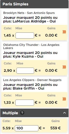 En vous inscrivant ici chez notre partenaire Betclic, votre premier pari est remboursé à hauteur de 100€*, pourquoi ne pas en profiter pour flamber un peu puisque vous ne risquez rien ? Ce soir on vous propose de miser sur des matchs à au moins 20 points de la part de 3 joueurs : LaMarcus Aldridge, Kyle Kuzma et Blake Griffin. Ils affronteront respectivement les Nets à Brooklyn, le Thunder à Oklahoma City et les Nuggets à Los Angeles.