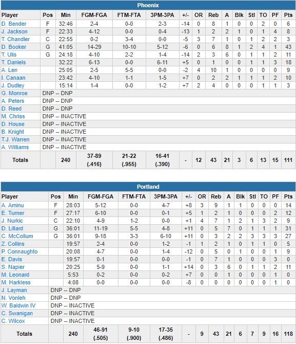 De retour à la maison après un zéro pointé en road trip (3 défaites en 3 matchs), les Blazers de Damian Lillard (31 points à 11/19, 5 rebonds et 7 passes) et C.J. McCollum (27 points à 9/18 dont 6/10 à 3-points, 3 rebonds, 2 passes, 2 contres et 3 interceptions) ont dominé les Suns d’un Devin Booker déchaîné (43 points à 14/29, 6 rebonds, 8 passes), 118-111.
