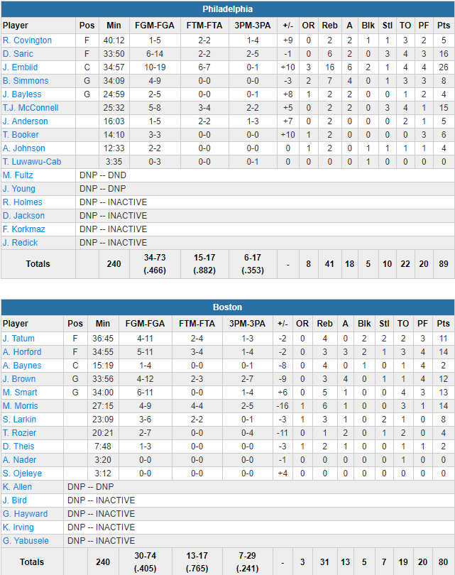 Sélectionné avant le match parmi les titulaires du All-Star Game, Joel Embiid a fait un énorme chantier avec 26 points à 10/19, 16 rebonds, 6 passes et 2 contres, bien aidé par Dario Saric (16 points à 6/14) et TJ McConnell (15 points à 5/8, tous en seconde mi-temps). Philly shoote à 46.6% et perd 22 ballons mais Boston est limité à 40.5% et 19 ballons perdus en plus de ne prendre que 3 rebonds offensifs. En l’absence de leur meneur et meilleur scoreur, Boston n’a pas pu compter sur un joueur à plus de 14 points. Marcus Morris et Al Horford terminent avec 14 points et Marcus Smart avec 13. Jayson Tatum (11 points à 4/11) et Jaylen Brown sont eux maladroits (12 points à 4/12).