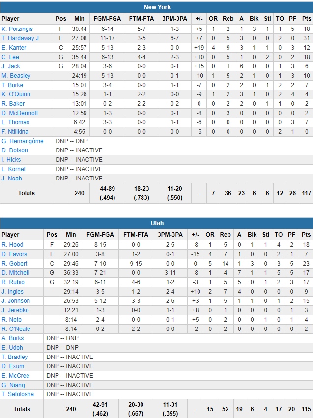 De retour, Rudy Gobert a pourtant sorti un énorme match avec 23 points à 7/10, 14 rebonds et 3 contres en 30 minutes. Mais en face les New Yorkais ont pu compter sur un super Tim Hardaway Jr., auteur de 31 points à 11/17 dont 6/7 derrière l’arc, bien épaulé par les 18 points de Kristaps Porzingis et Courtney Lee. Les Knicks shootent à un excellent 49.4% dont 11/20 derrière l’arc. Utah a moins de réussite avec 46.2% et perd surtout 17 ballons, compensés tout de même par 17 rebonds offensifs. Donovan Mitchell a manqué d’adresse avec 17 points à 7/21. Ricky Rubio ajoute lui aussi 17 points et Rodney Hood 18.