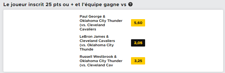 Pour le pari un peu moins risqué, on va miser sur la performance de LeBron James et des Cavaliers. Il ne manque que 25 points à LeBron James pour atteindre la barre mythique des 30 000 points et il a annoncé avant-hier vouloir le faire devant ses enfants. On le voit mal rater le coche et on peut même anticiper un grand match, et une victoire des siens face au Thunder, même si ce ne sera pas simple. La cote de 2.05 (elle peut varier) pour un match à au moins 25 points de LeBron + une victoire des Cavs est tentante donc on va mettre les 100€ dessus pour un gain potentiel de 105€.