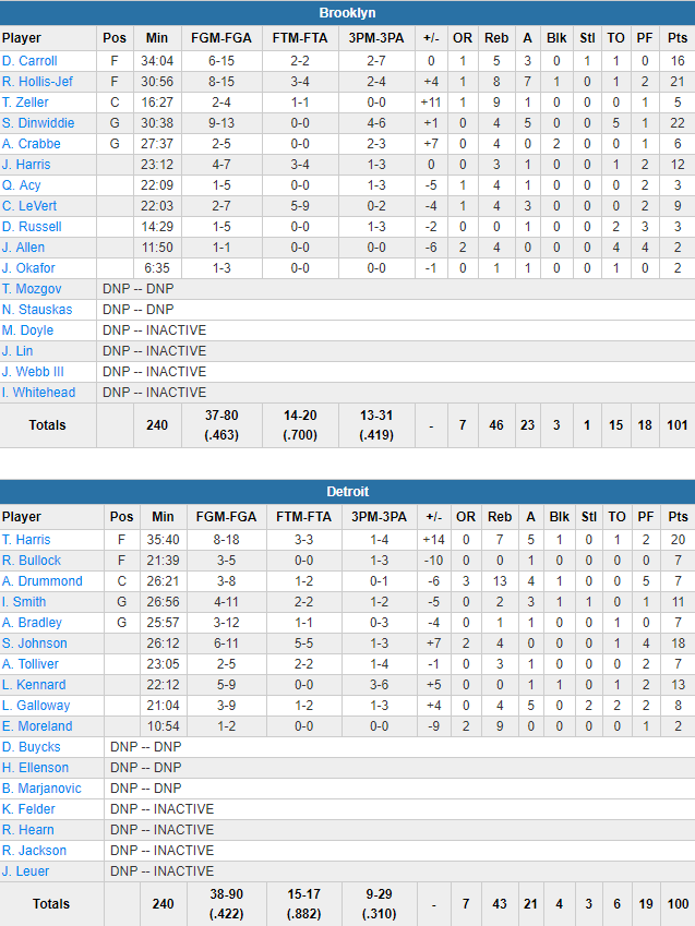Dinwiddie signe 22 points à 9/13, 4 rebonds et 5 passes, bien épaulé par Rondae Hollis-Jefferson (21 points, 8 rebonds et 7 passes) et DeMarre Carroll (16 points à 6/15). Brooklyn shoote à 46.3% dont un joli 13/31 alors que Detroit a été bien plus à la peine et mené quasiment toute la rencontre avec un petit 42.2% dont 9/29 à 3-pts mais compensé par seulement 6 ballons perdus. Tobias Harris signe 20 points à 8/18, 7 rebonds et 5 passes alors que Stanley Johnson ajoute 18 points et Luke Kennard 13. Andre Drummond est limité à 7 points à 3/8, 13 rebonds et 4 passes.