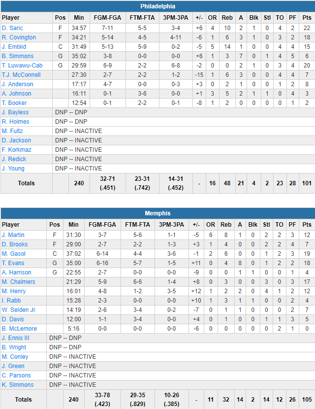 Marc Gasol (19 points à 6/14 et 6 rebonds) et Tyreke Evans (18 points à 6/16 et 8 passes) ont mené le comeback des Grizzlies en dernier quart alors que Mario Chalmers (17 points à 5/9) a rentré deux lancers capitaux à 6.2 secondes de la fin. Si Memphis shoote à seulement 42.3% ils perdent 11 ballons de moins que les Sixers, qui donnent pas moins de 23 munitions à leur adversaire. Philly shoote à 45.1%M dont un excellent 14/31 à 3-pts mais n’ont pas pu compter sur un Joel Embiid des grands jours, limité à 15 points à 5/13, 14 rebonds et 3 ballons perdus, ni un grand Ben Simmons (6 points à 3/8, 7 rebonds et 4 ballons perdus). Dario Saric ajoute 22 points à 7/11 et 11 rebonds, Robert Covington 18 points à 5/14 alors que le Français Timothé-Luwawu Cabarrot sort un super match avec 20 points à 6/9 dont 6/8 à 3-points.