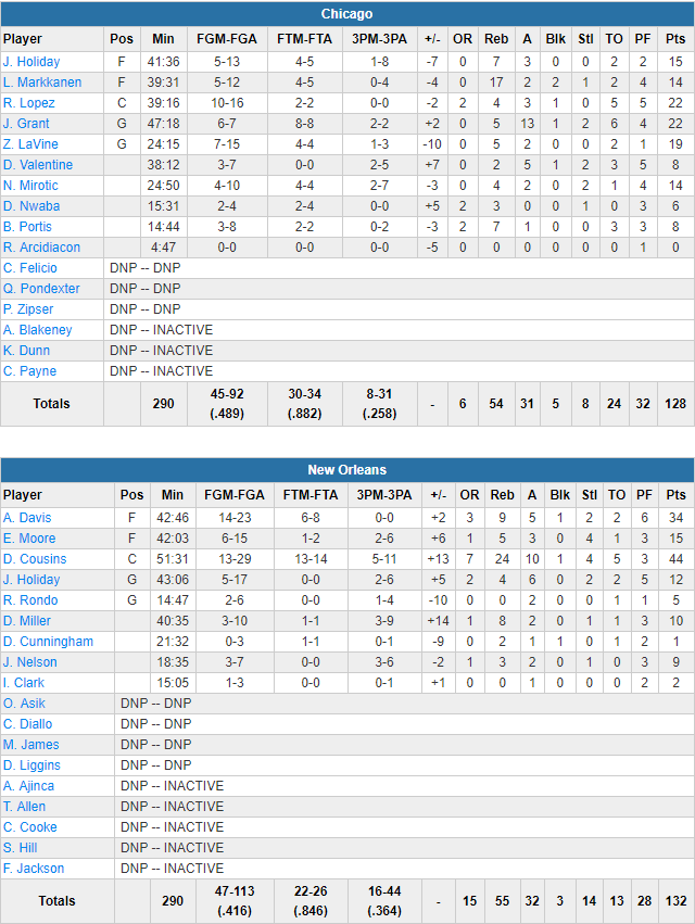 Aucune équipe n’a réussi à faire la différence en première prolongation malgré une dernière occasion pour les Pelicans mais le 3-pts de Ian Clark et la claquette d’Holiday ont été ratés. Alors que Davis a été sorti pour 6 fautes, Cousins a assuré dans la seconde prolongation avec les 5 premiers points. Chicago est revenu à 2 unités à 31 secondes de la fin mais il a rentré 2 lancers qui ont plié le match.