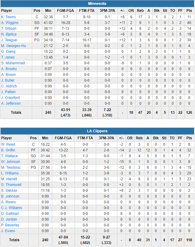 L’homme du match n’est pas à chercher bien loin c’est Andrew Wiggins, auteur de 40 points à 16/28 dont 3/7 à 3-pts et 6 rebonds ! Il a été parfaitement aidé par Jeff Teague, auteur de 30 points à 7/14 mais surtout 16/17 sur la ligne des lancers et 6 passes et des paniers clutcs. Minnesota n’a même pas eu besoin d’un grand Karl-Anthony Towns, limité à 11 points à 1/7 et 17 rebonds. Nemanja Bjelica (18 points à 6/13 et 9 rebonds) et Taj Gibson (14 points et 6 rebonds) ont eux été très précieux alors que le banc est une nouvelle fois quasiment inexistant. Les Wolves shootent à 47.3% contre 56% aux Clippers, mais ils captent 18 rebonds offensifs et rentrent surtout 33 lancers contre 15 aux locaux. Ils se sont appuyés sur un trio Blake Griffin (32 points à 13/22, 12 rebonds et 12 passes), Lou Williams (20 points à 8/15 et 7 passes) et Montrezl Harrell (23 points à 8/13 et 6 rebonds)