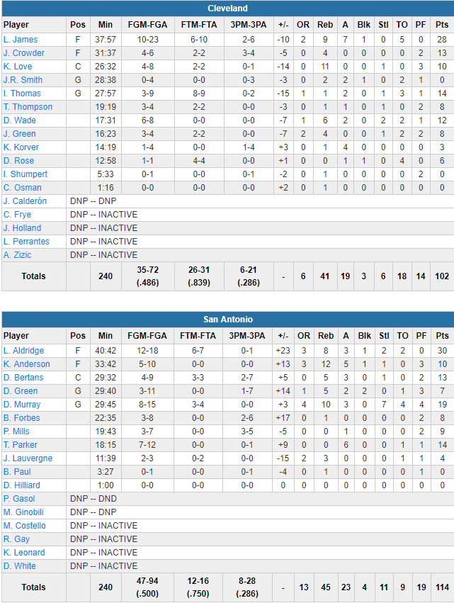 Cela avait pourtant pas trop mal débuter pour Cleveland sous l’impulsion de LeBron, qui a rapidement atteint les 7 points et permis aux Cavaliers de mener 16-10 puis 29-25 après 12 minutes. Les 22 premières minutes du match ont été très très équilibrés et il a fallu atteindre les deux dernières minutes de la première mi-temps pour voir San Antonio prendre le contrôle. Ils ont terminé sur un 11-2 sous l’impulsion de Parker, Green et Forbes, 63-55. Plus jamais Cleveland n’a revu les joueurs de Gregg Popovich qui ont creusé l’écart au retour des vestiaires en prenant plus de 10 points d’avance, 76-72. LeBron a permis aux siens de s’accrocher et même de revenir à seulement 3 points dans les dernières minutes du 3ème mais sans revenir plus près, la faute à Kyle Anderson et au 3-pts de Patty Mills pour conclure le quart sur le score de 89-81. Cleveland est restée à portée en début de dernier quart mais sans jamais pouvoir emballer la rencontre, trop maladroit. A 4’20 de la fin, Murray a piqué un ballon à LeBron James pour offrir un 3-pts Danny Green qui a porté le score à 105-94 et plié l’affaire.