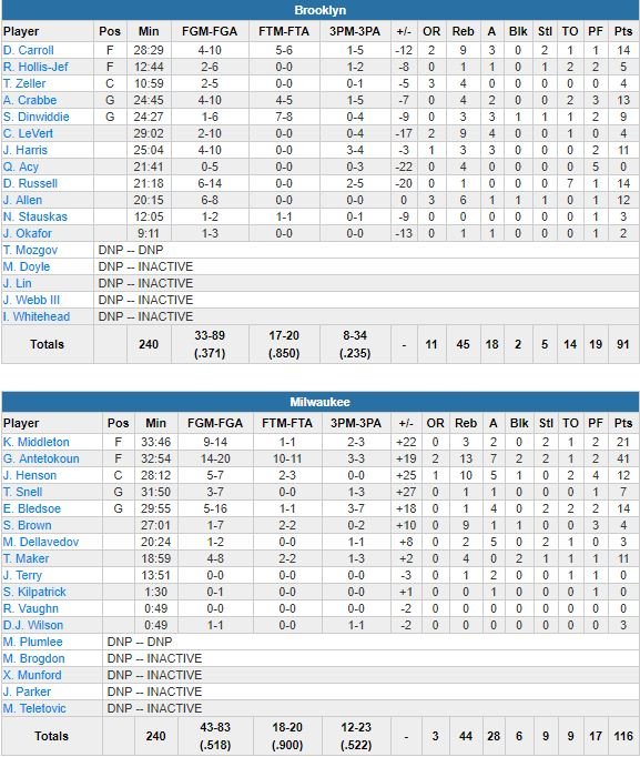 Khris Middleton ajoute 21 points dans cette deuxième victoire en deux matchs depuis le licenciement de Jason Kidd. Milwaukee a pris jusqu’à 28 points d’avance en première mi-temps (conclue sur le score de 58-35 à l’avantage des locaux). Limités à 35 points sur les deux premiers quarts, les Nets (menés 16-2 d’entrée) de DeMarre Carroll et D’Angelo Russell (14 points chacun) vont inscrire 37 points dans le seul troisième quart, ce qui leur permettra de revenir au mieux à 7 points en fin de période. La fête a été de courte durée puisque les 12 dernières minutes ont totalement été à l’avantage des Bucks, 35-19.