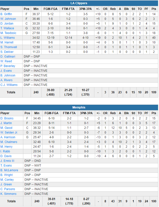 Les Clippers mettent fin à leur série de 3 défaites à Memphis dans le sillage d’un Lou Williams monstrueux, auteur de 40 points à 12/19, 10 passes et 4 interceptions. Milos Teodosic ajoute 18 points, Blake Griffin 14 points, 8 rebonds et 5 passes et DeAndre Jordan 15 oints et 9 rebonds. En face Marc Gasol signe un triple-double avec 13 points, 12 rebonds, 10 passes et 5 contres mais personne ne dépasse les 17 points et l’équipe perd 19 ballons. Les Californiens ont pris les commandes en second quart pour ne plus jamais les lâcher.