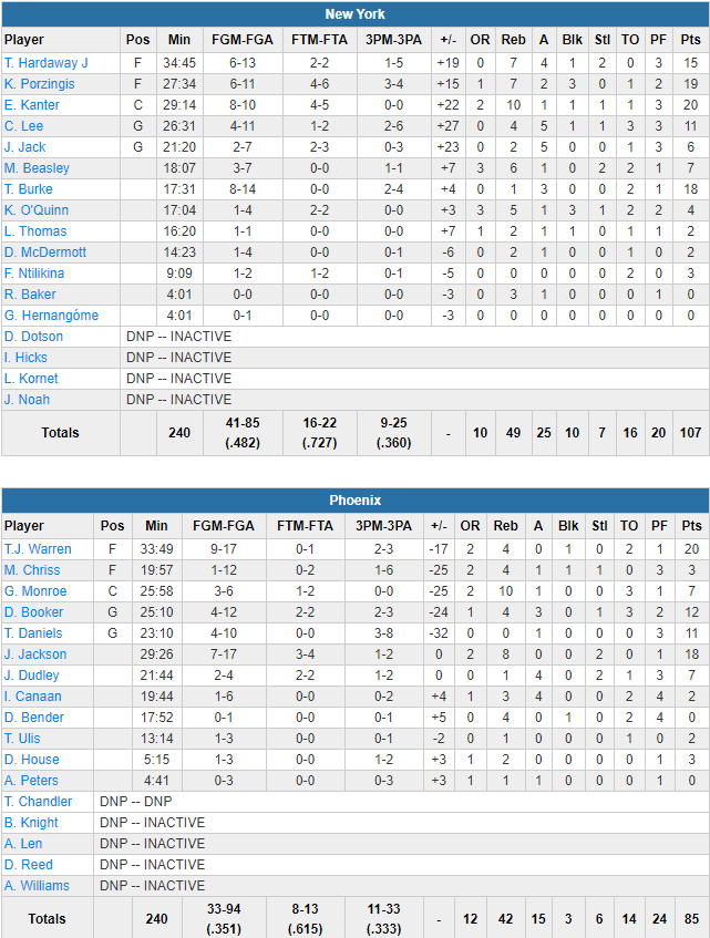 Une victoire qui fait du bien aux Knicks, qui s’imposent à Phoenix 107-85 dans le sillage d’Enes anter (20 points et 10 rebonds), Kristaps Porzingis (19 points) et Trey Burke (18 points à 8/14). Les Suns sont limités à un piteux 35.1% avec 20 points pour TJ Warren, 12 pour Devin Booker à 4/12.
