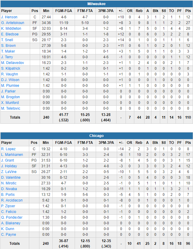 Seconde victoire de suite pour les Bucks sous l’ère Joe Prunty et belle victoire. Ils s’imposent avec la manière à Chicago sur le score de 110-96. Ils portent ainsi leur bilan à 26-22 pour prendre 3.5 matchs d’avance sur Detroit alors que Chicago est à 18-32.