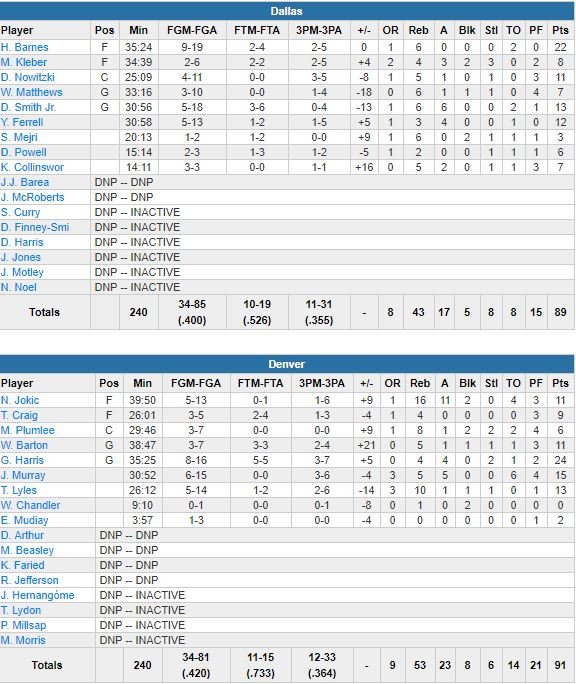 Les Nuggets ont eux battu Dallas sur le fil au Pepsi Center. Et pour une fois en marquant peu de points. Nikola Jokic a enregistré un triple-double sur son dernier shoot pour faire passer Denver devant, avec 11 points, 16 rebonds et 11 passes. Gary Harris ajoute 24 points et l’équipe est revenu d’un déficit de 9 points dans le dernier quart pour aller chercher cette 3ème victoire de rang. Dallas, mené par les 22 points d’Harrison Barnes et les 13 points, 6 rebonds et 6 passes de Dennis Smith Jr., perd un 3ème match d’affilée.