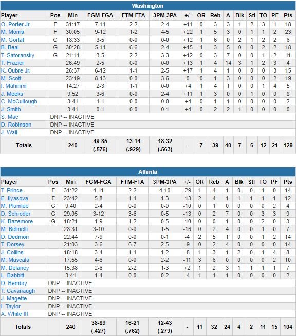 Retour sur les deux derniers matchs de la nuit, avec pour commencer la victoire des Wizards à Atlanta, sans John Wall (genou). Mais avec une ligne arrière Tomas Satoransky – Tim Frazier extrêmement propre : 21 passes (dont 14 pour le seul Frazier) et seulement 3 ballons perdus à eux deux. Markieff Morris a égalé son record en saison avec 23 points (dont 4 tirs à 3-points) dans ce match contrôlé à partir du 2ème quart (via un 11-2) et jusqu’au bout par Washington (18 tirs à 3-points). Bradley Beal et Otto Porter Jr. signent 18 points chacun tandis qu’en face, 3 joueurs des Hawks terminent à 14 unités.