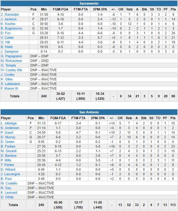 Après le coup de gueule de Pop dans les vestiaires, les Spurs ont répondu en infligeant un 64-48 à leurs adversaires sur le reste de la rencontre. Bryn Forbes a battu son record en saison (23 points à 9/15, 3 rebonds et 2 passes), LaMarcus Aldridge et Manu Ginobili ont chacun signé 15 points, Dejounte Murray 14 points et 10 passes et Pau Gasol 14 points et 11 rebonds. À 18/34 à 2-points, Sacramento a été de son côté mené par les 26 points de De’Aaron Fox et les 21 points de Vince Carter.